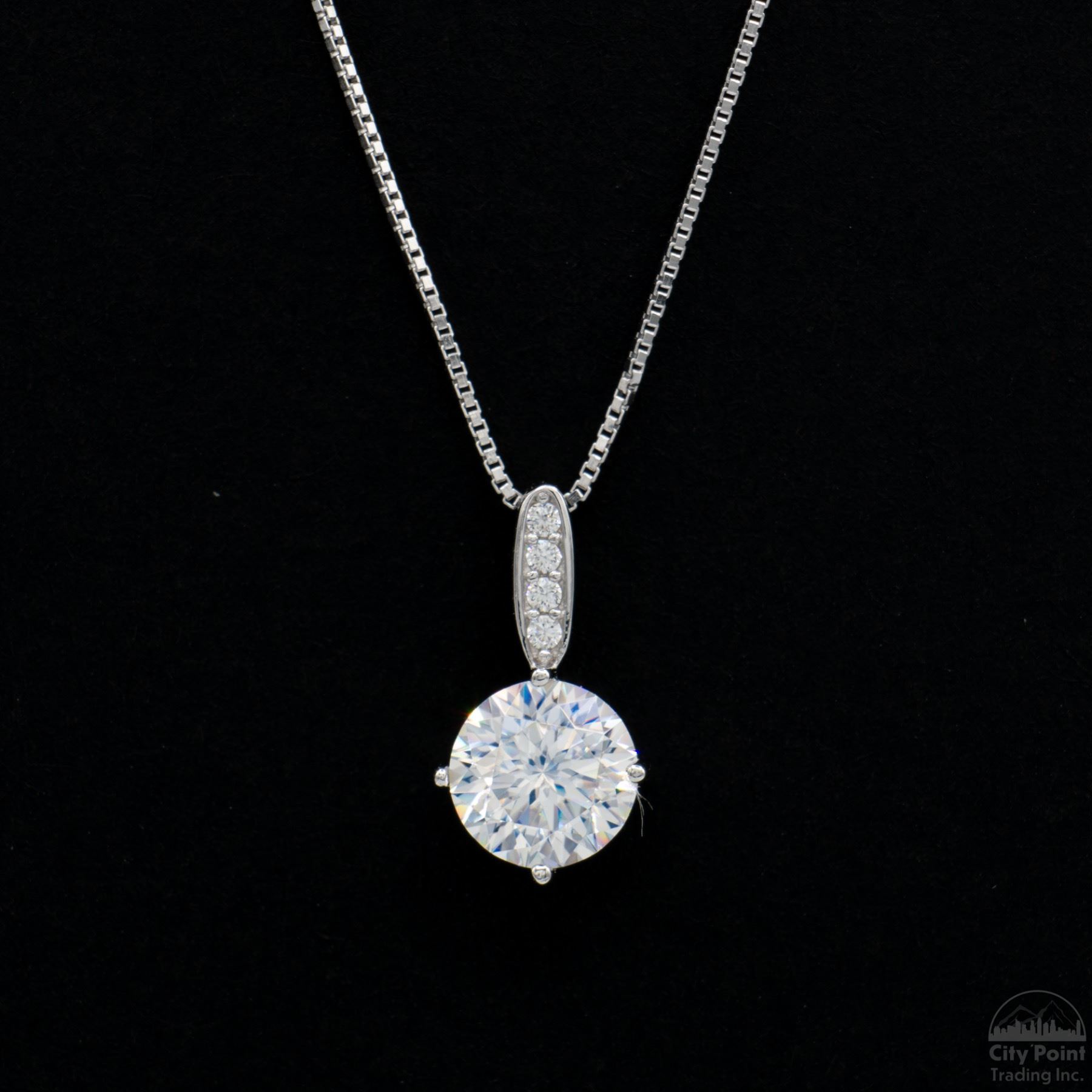 One stamped S925 platinum-plated sterling silver necklace weighing 1.80 grams, featuring a pendant with a single prong-set round cut moissanite, approximately 1.00 carat. Condition is new. Comes with a box, pouch, and display box.