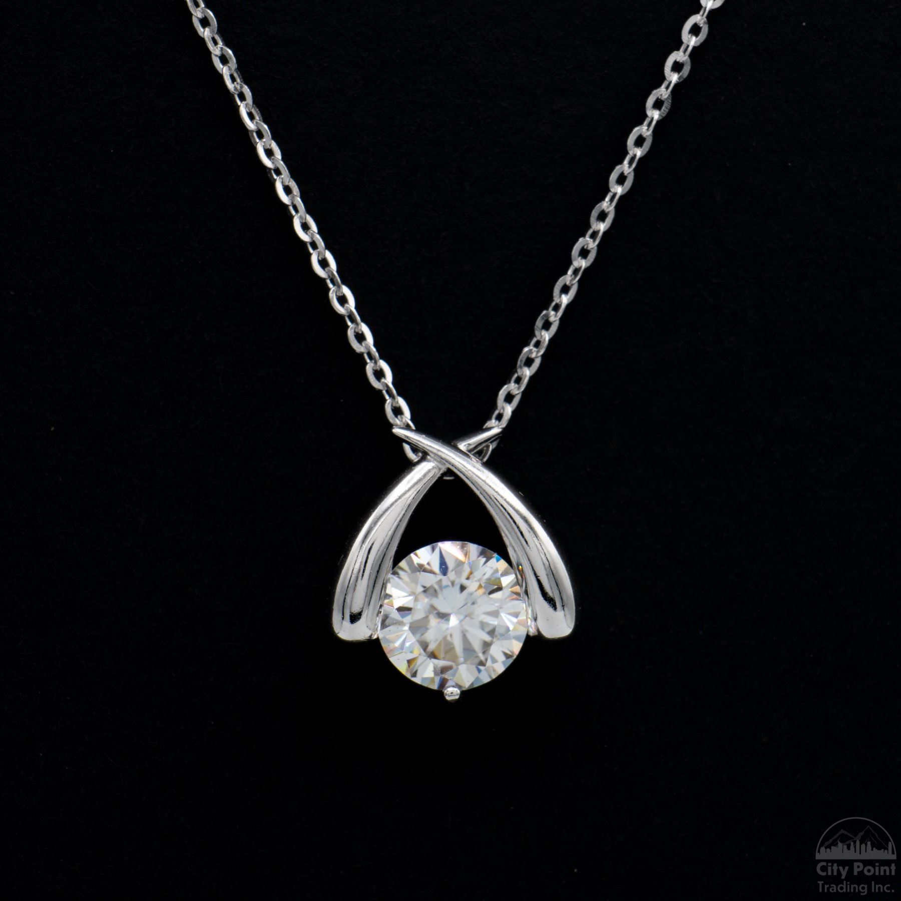 One stamped S925 platinum-plated sterling silver necklace weighing 2.35 grams, featuring a pendant with a single prong-set round cut moissanite, approximately 1.00 carat. Condition is new. Comes with a box, pouch, and display box.