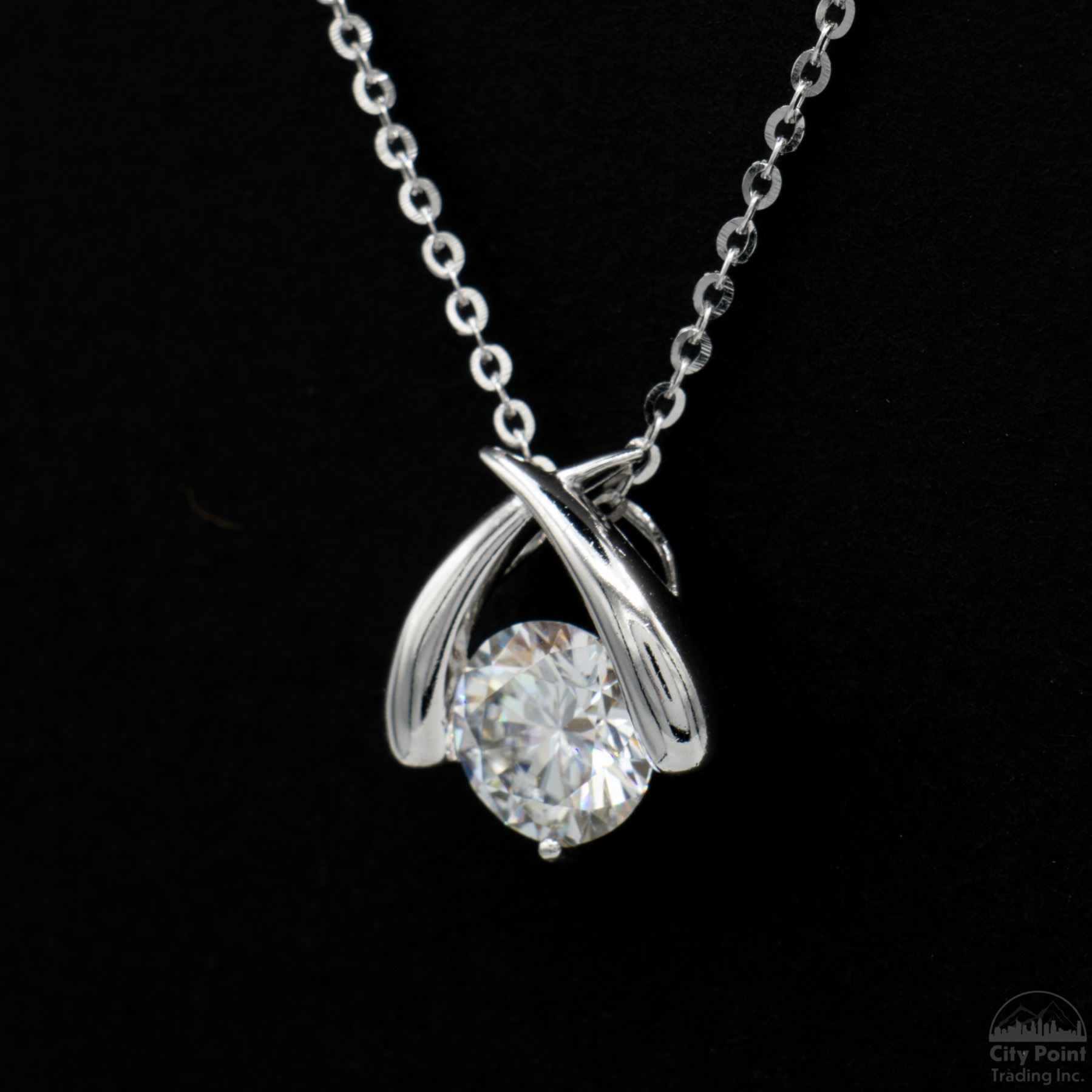 One stamped S925 platinum-plated sterling silver necklace weighing 2.35 grams, featuring a pendant with a single prong-set round cut moissanite, approximately 1.00 carat. Condition is new. Comes with a box, pouch, and display box.