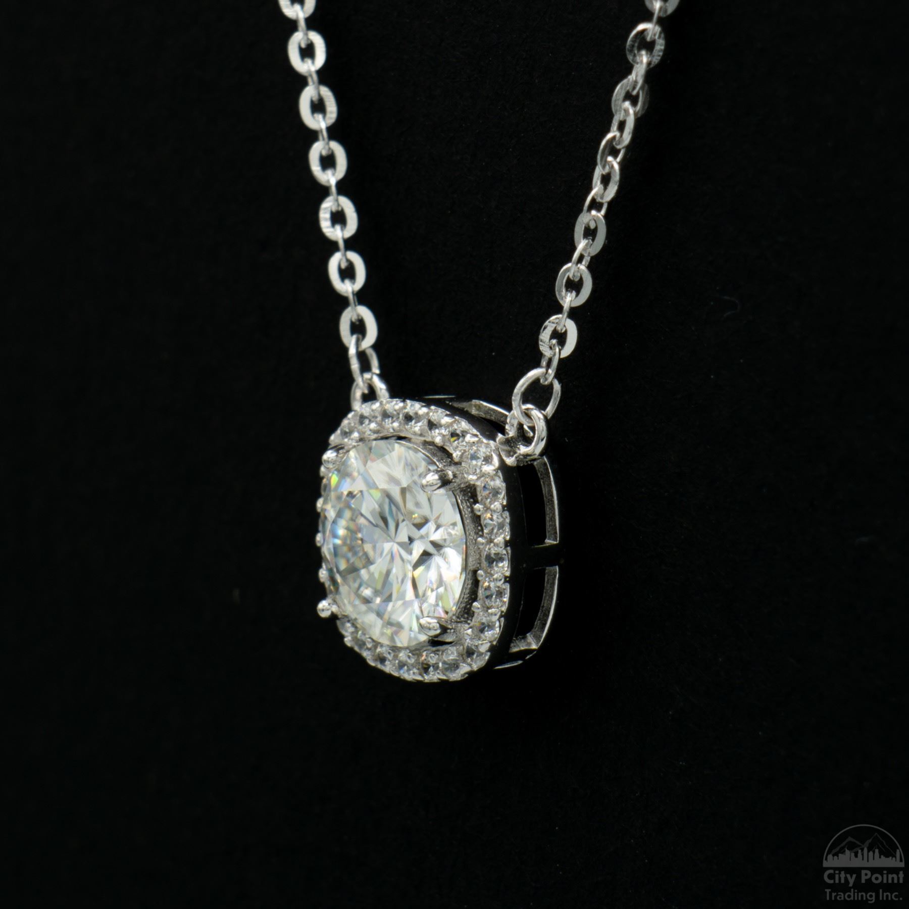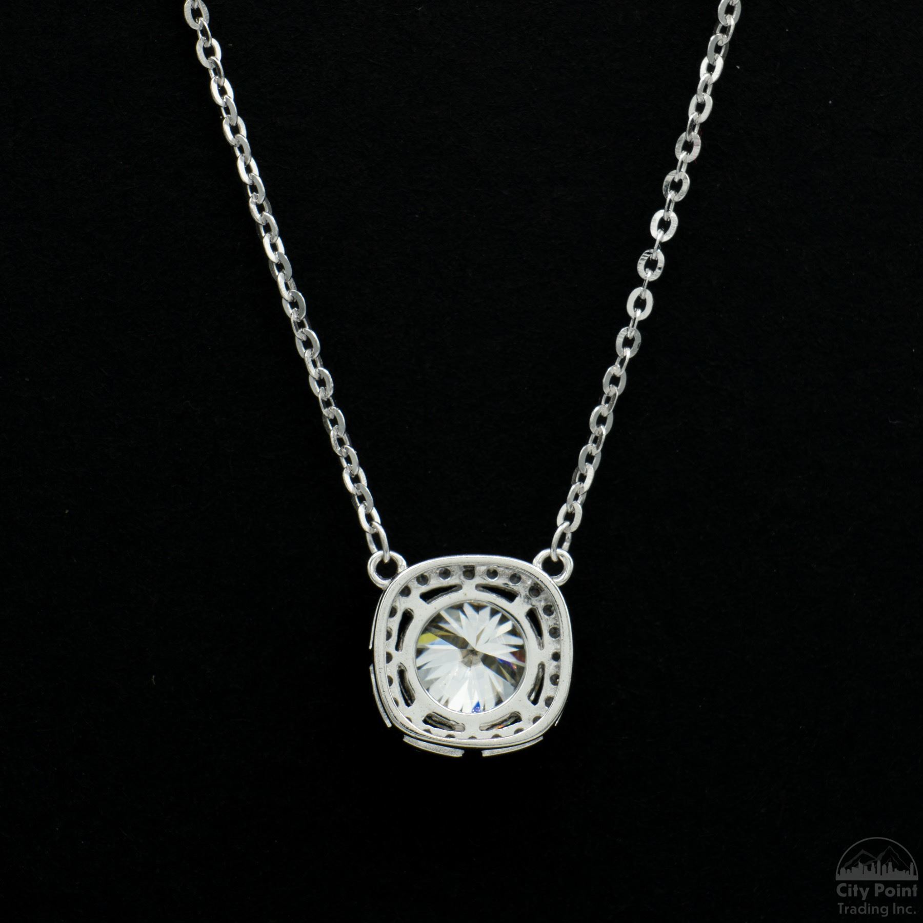 One stamped S925 platinum-plated sterling silver necklace weighing 1.77 grams, featuring a pendant with a single prong-set round cut moissanite main stone, approximately 1.00 carat. Condition is new. Comes with a box, pouch, and display box.