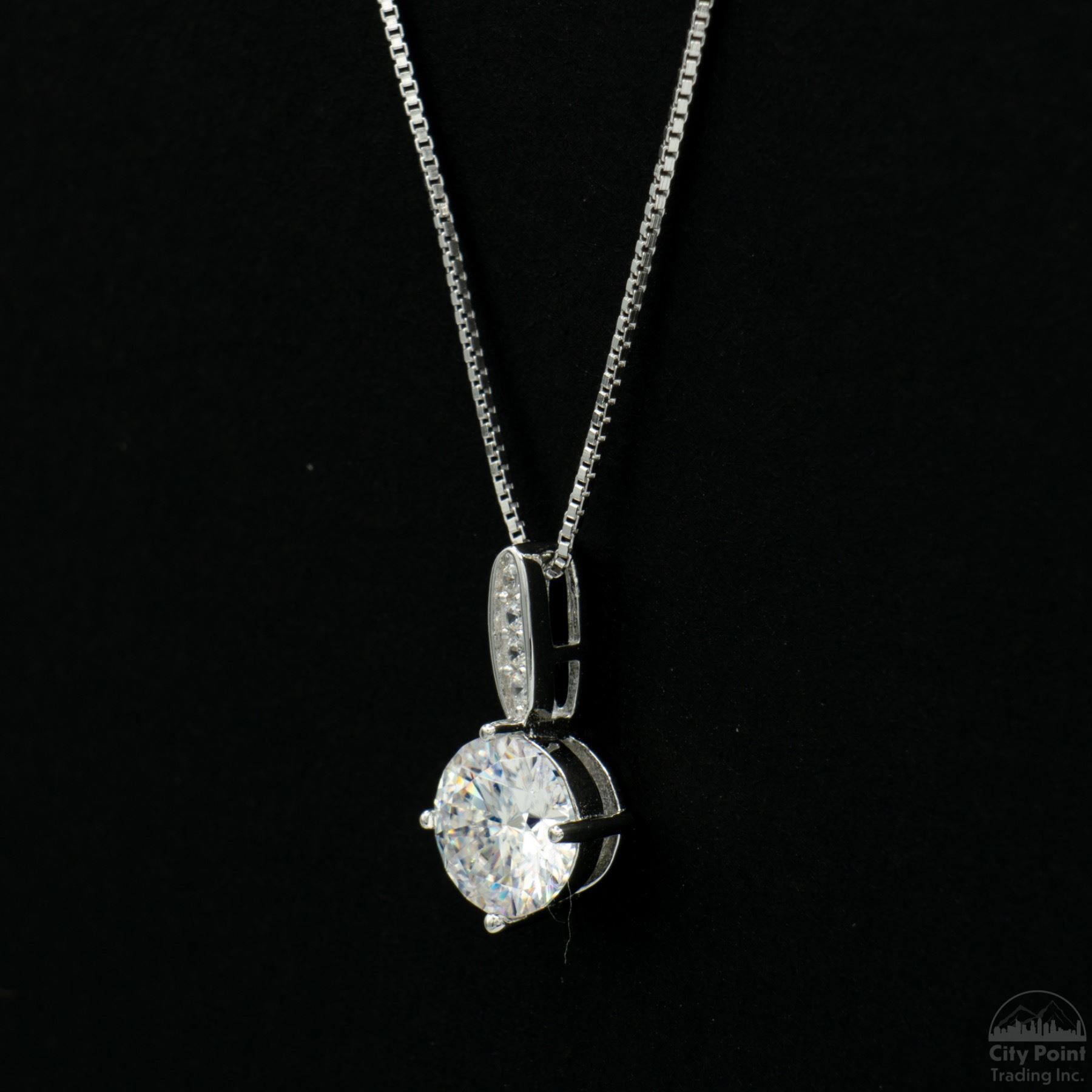 One stamped S925 platinum-plated sterling silver necklace weighing 1.80 grams, featuring a pendant with a single prong-set round cut moissanite, approximately 1.00 carat. Condition is new. Comes with a box, pouch, and display box.