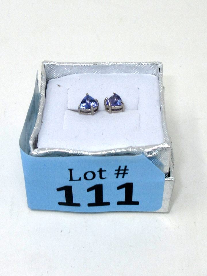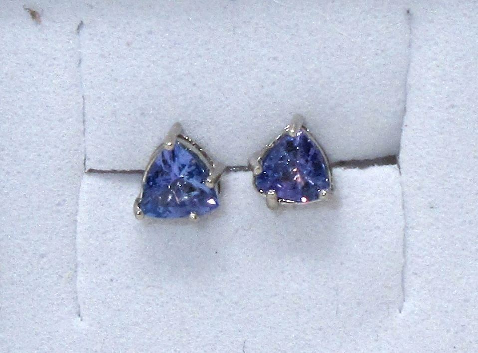 Trillion cut. Post & butterfly backs. Lively purple blue. Includes $320 certificate.