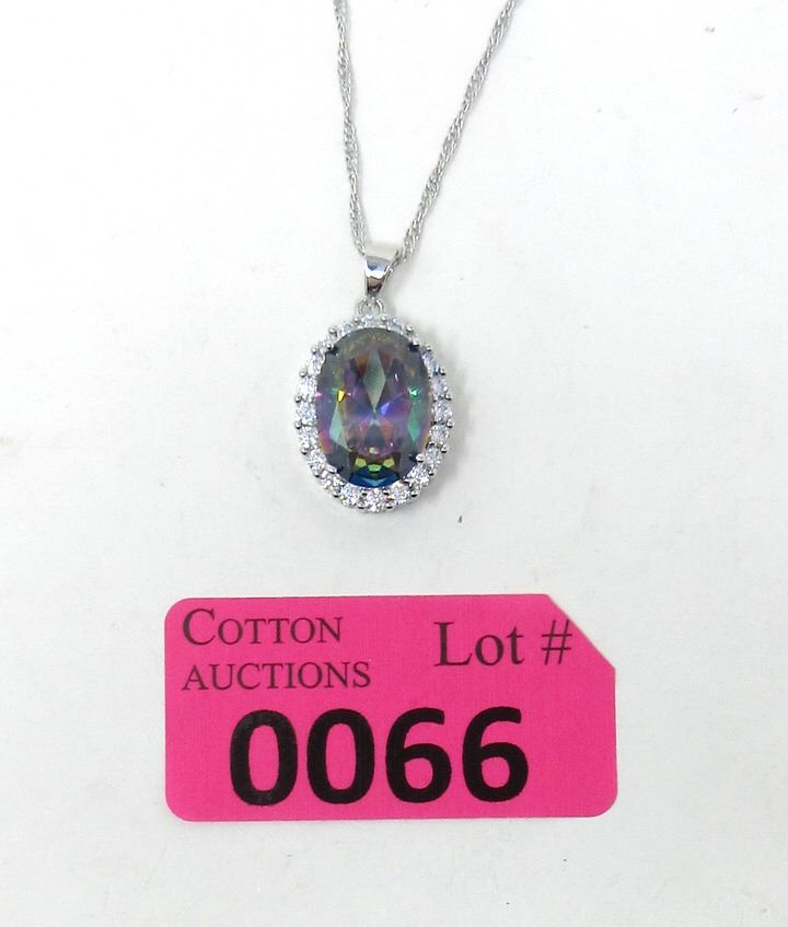12.5 mm x 17.5 mm topaz is surrounded by 20 clear crystals. 17" Silver chain.