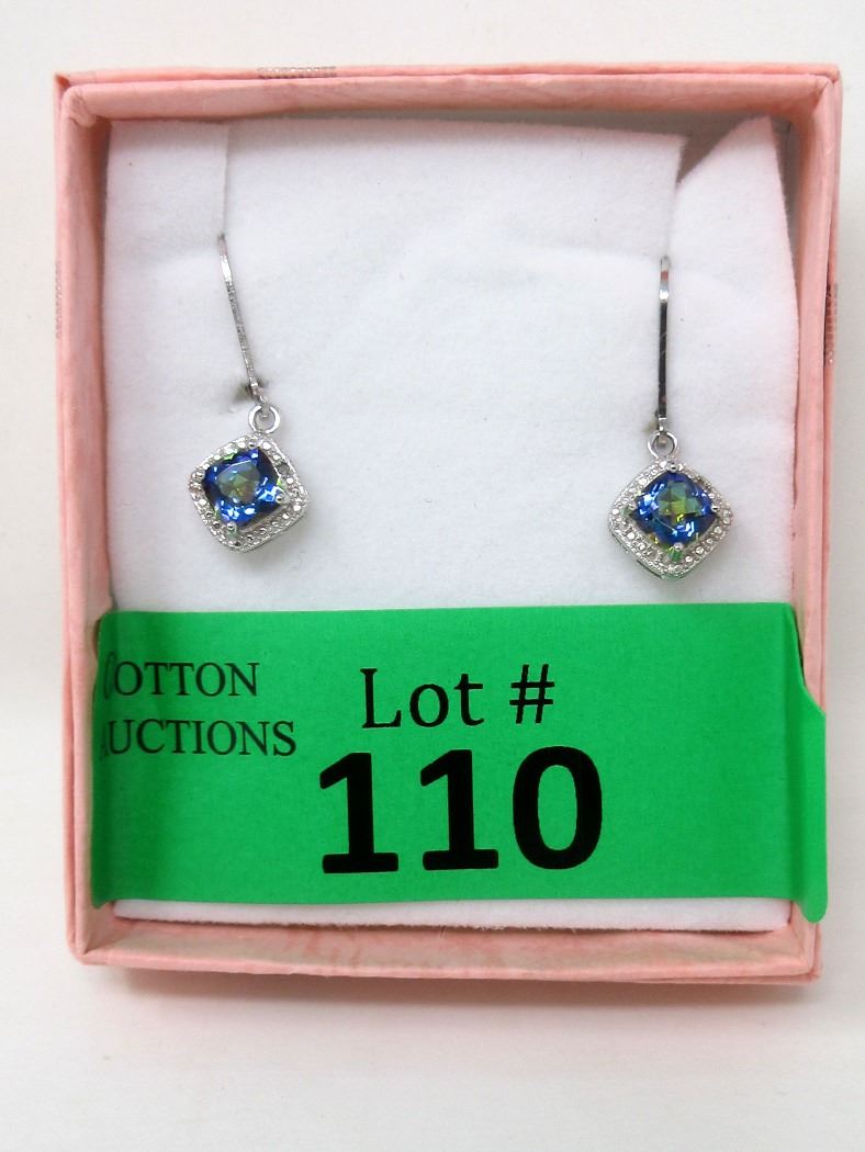 Ocean blue, princess cut topaz set in sterling silver. Lever style backs. Retail value $290.