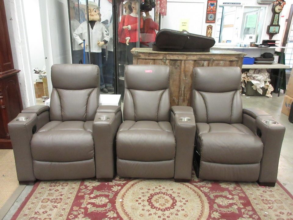 Manual reclining. Storage in the arms, cup holders, and all 3 seats recline.