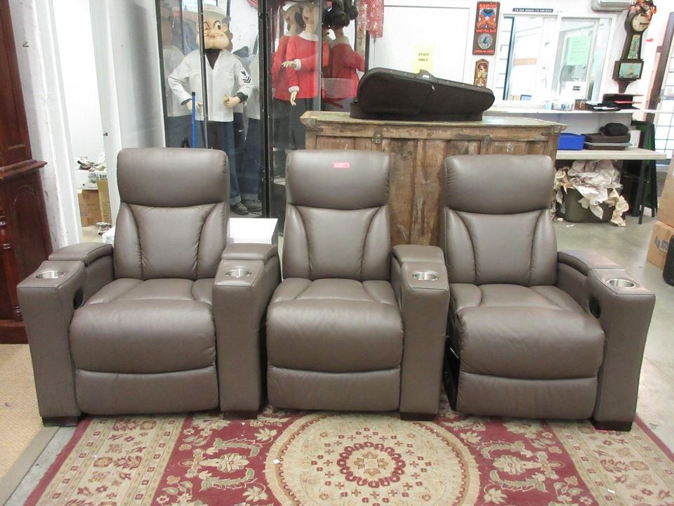 Manual reclining. Storage in the arms, cup holders, and all 3 seats recline.