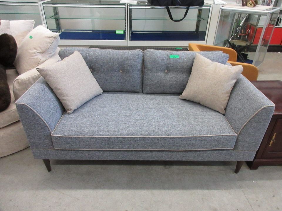 Love Seat is a Blue/Grey colour. Includes 2 throw cushions.