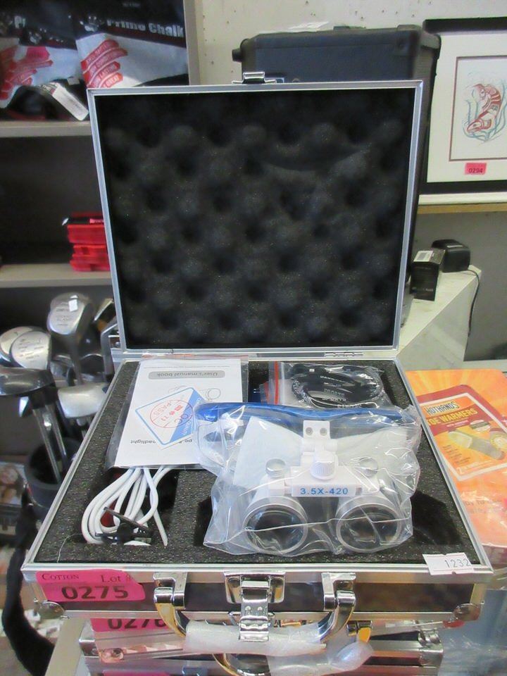 Removable 5 Watt Portable LED Headlight With Clip Filter. Glasses have attached 3.5X 420MM Binocular Loupe. Blue or White. Aluminum Box. Retail $74.99.