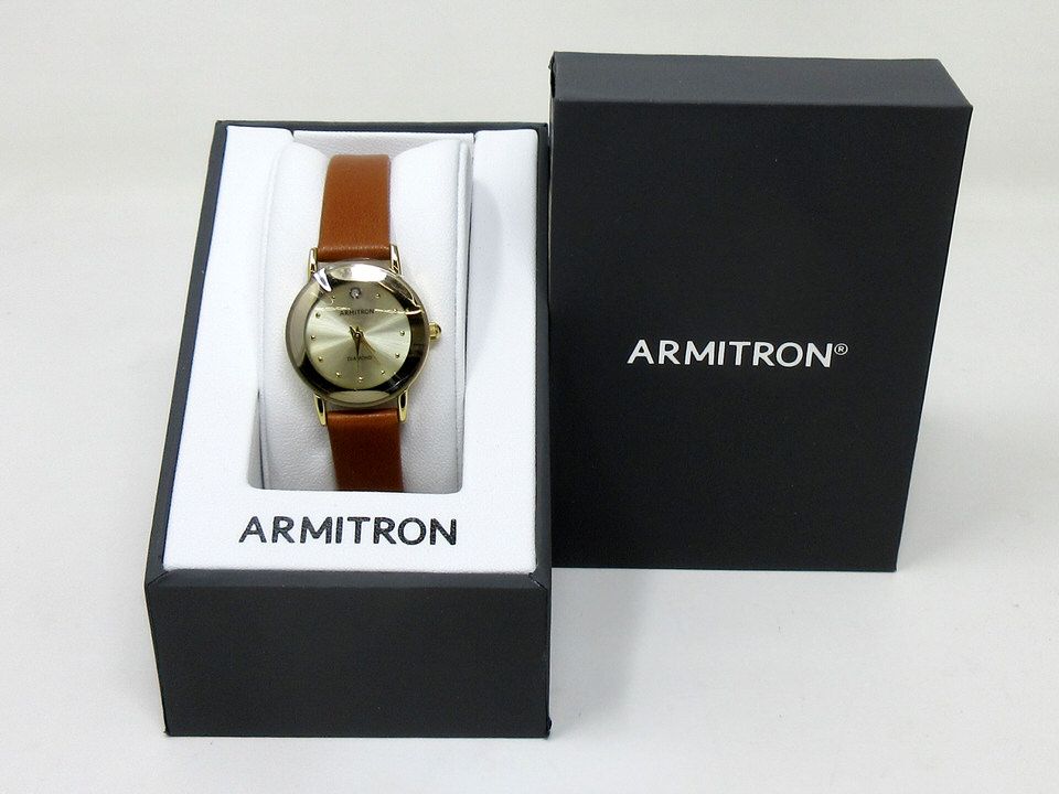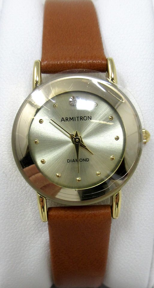 Brown leather band. 24 mm wide face with diamond at 12 o'clock. Complete with gift box.