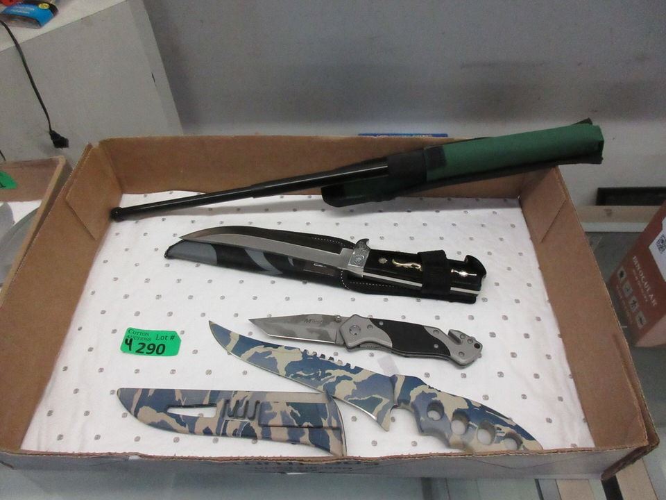 Survival knife, 3" blade folding knife and knife with 7" blade.