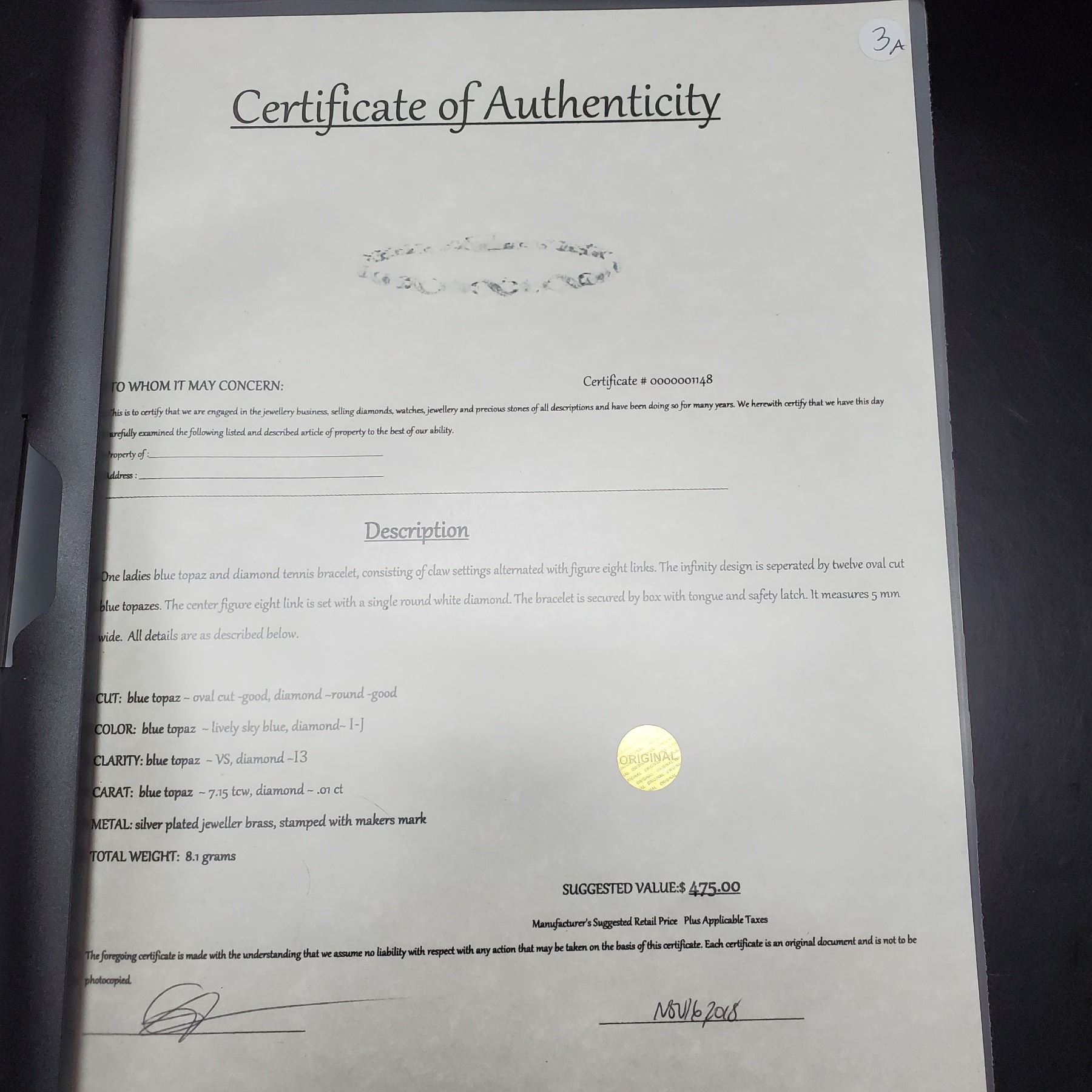 Suggested Retail $475 W/Certificate, - 17% Buyer Fee. Payment Processed through Live Auction World ( Visa or Master Card ) pick up Saturday, or Tuesday
