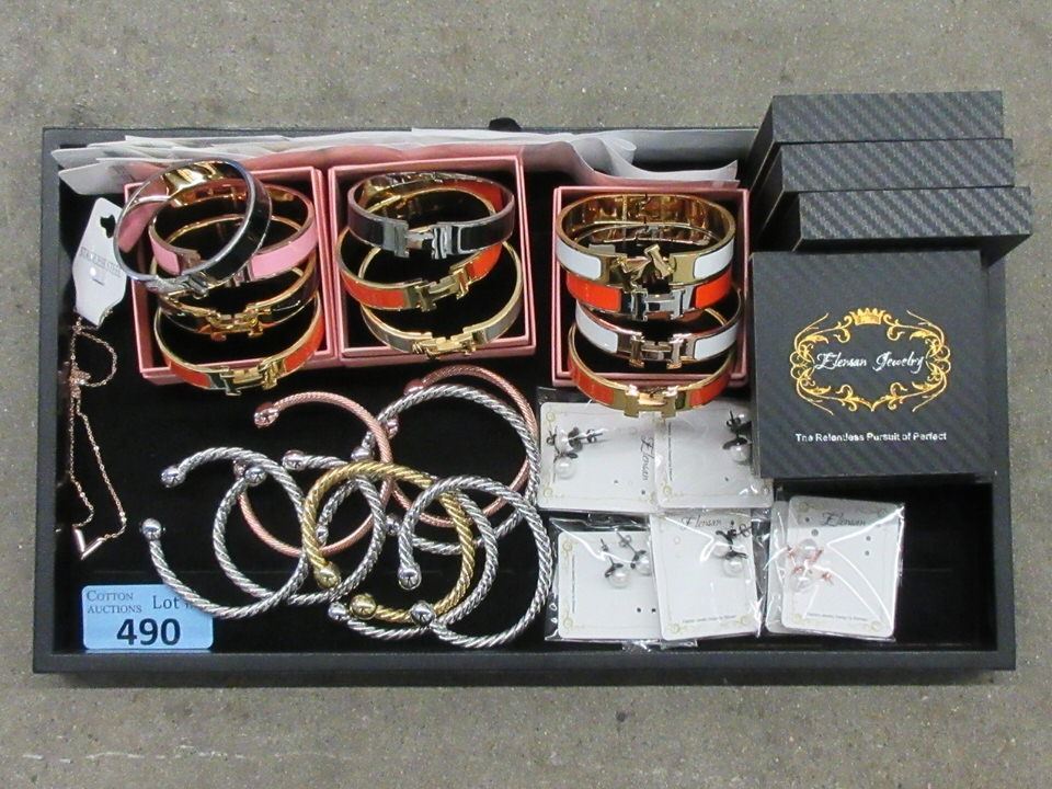 11 Hinged enamel bangle bracelets, 8 pairs of Faux Pearl post earrings with gift boxes, and 5 new Stainless Steel "V" necklaces and more.