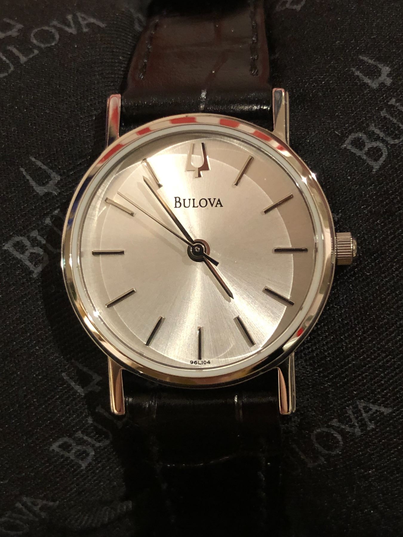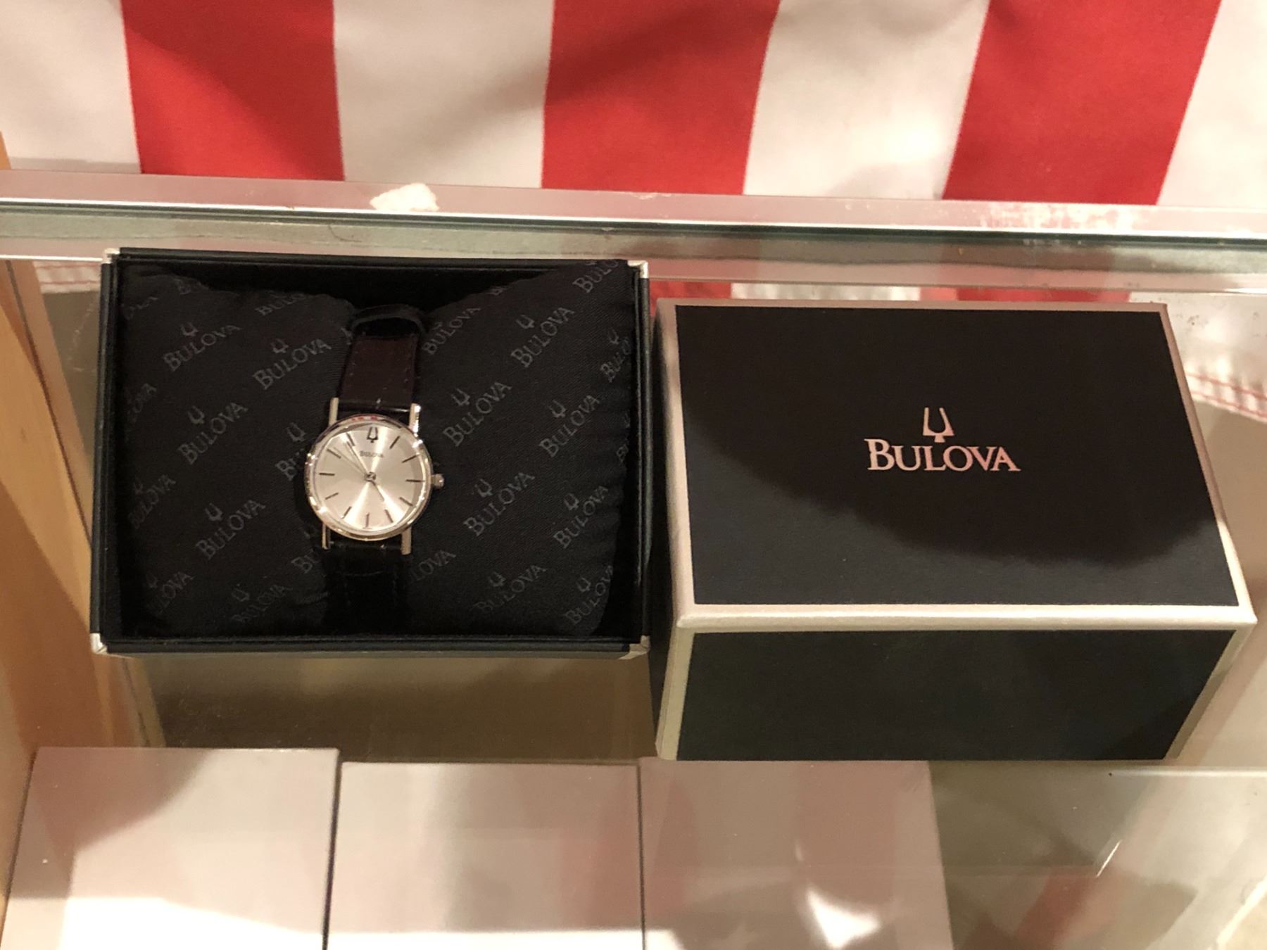 New Bulova lady's wrist watch w/black leather strap (new and box)