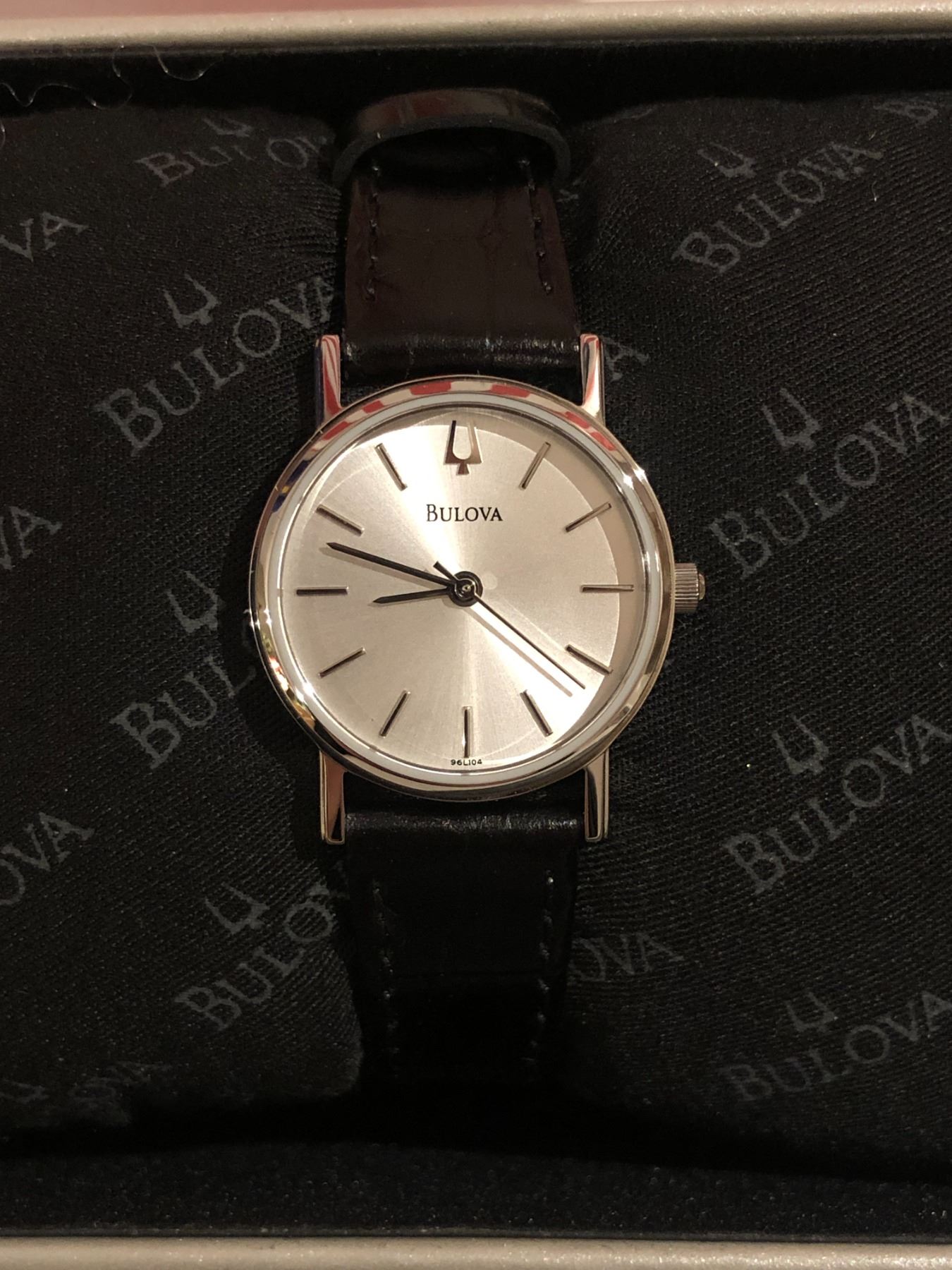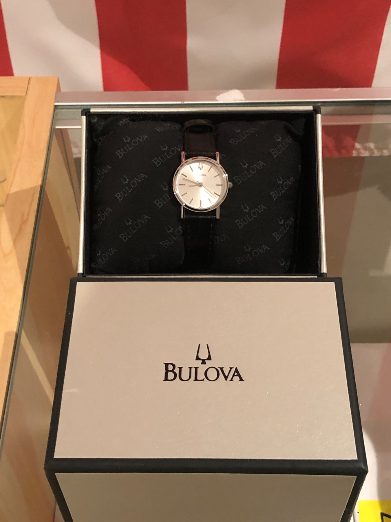 New Bulova lady's wrist watch w/black leather strap (new and box)