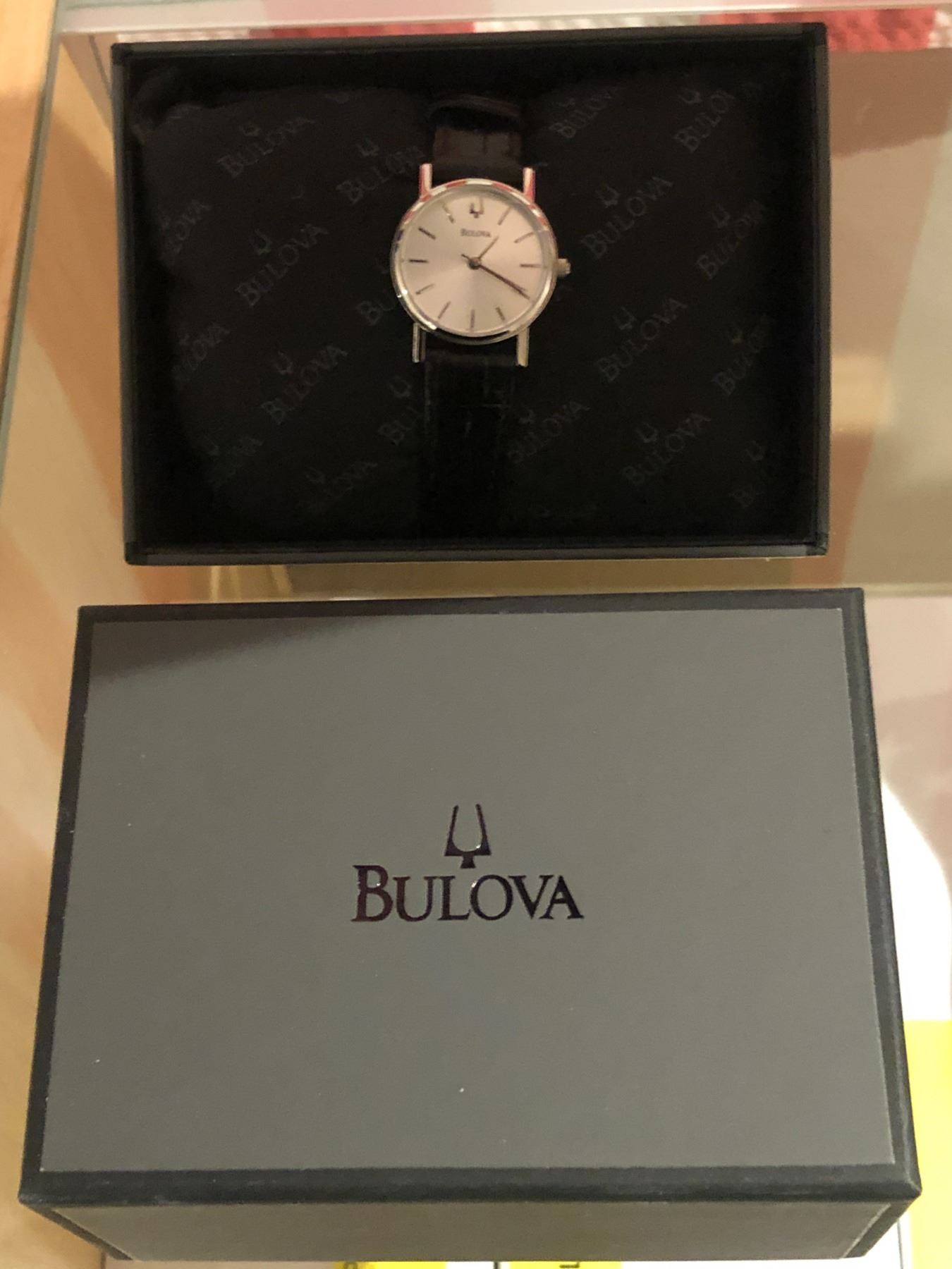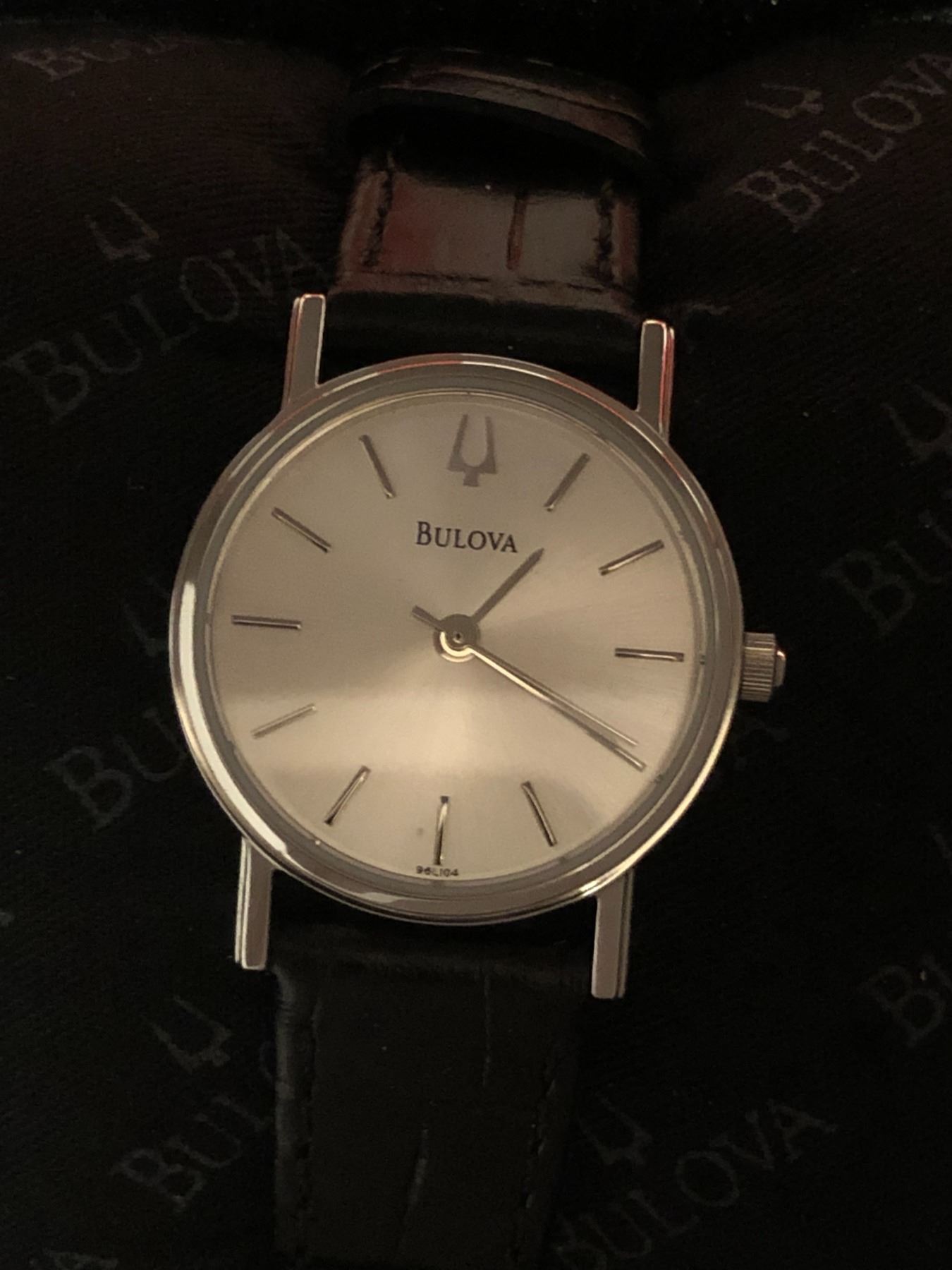 New Bulova lady's wrist watch w/black leather strap (new and box)