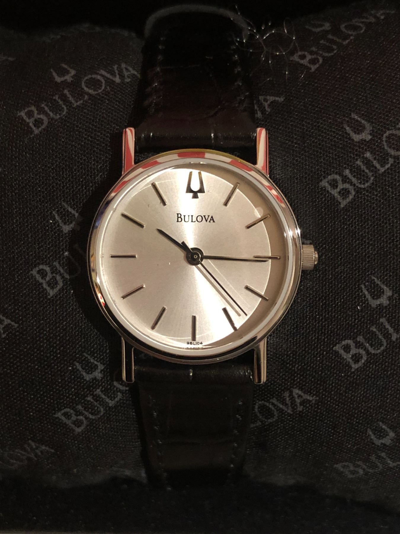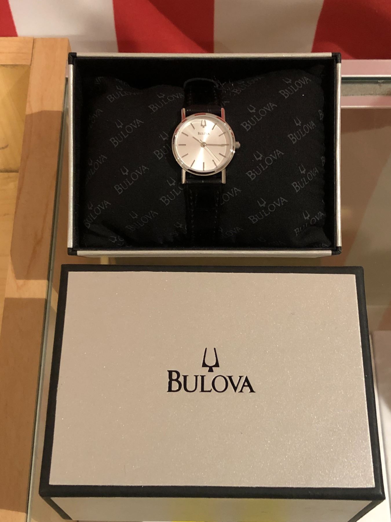 New Bulova lady's wrist watch w/black leather strap (new and box)