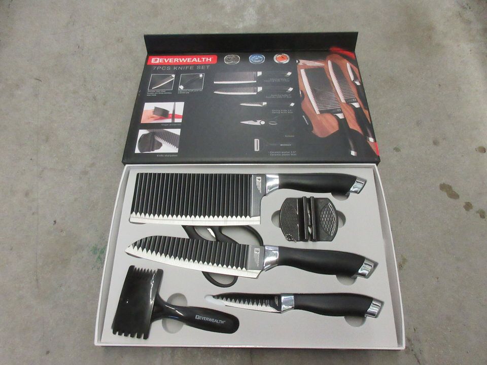 7" Cleaver, 7" Santoku, 3.5" paring, scissors and 3.5" peeler.