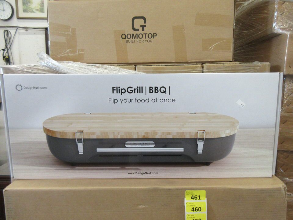 Flippable grids and integrated cutting board. 9" x 24" x 6" tall.