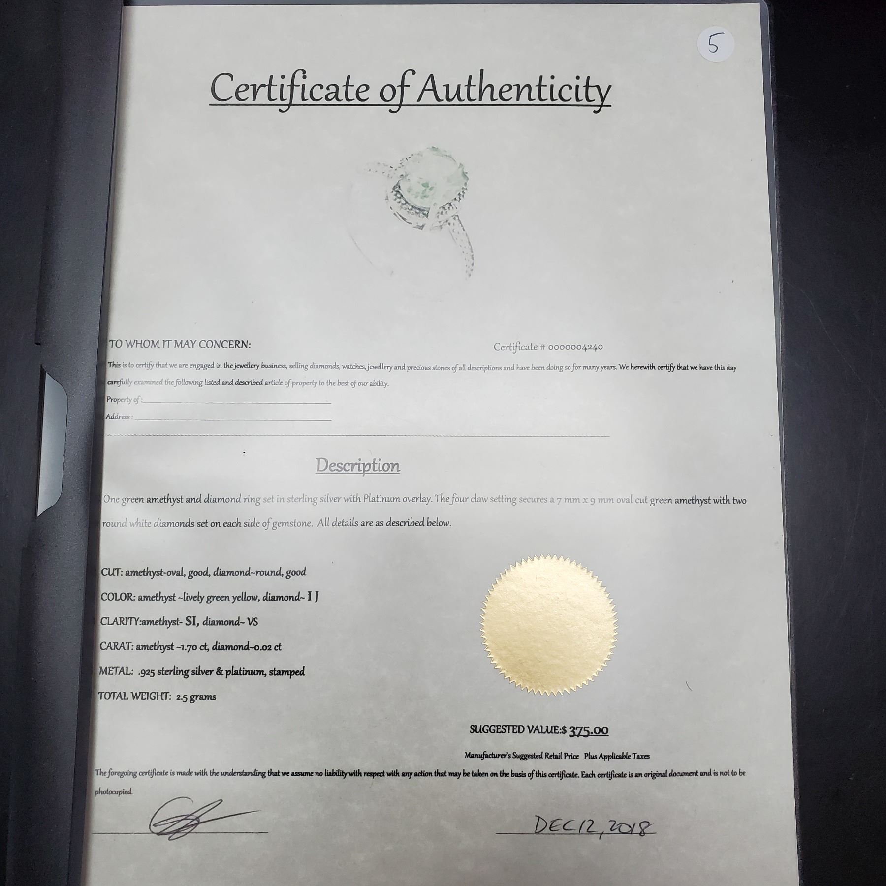 Suggested Retail $375 W/Certificate, - 17% Buyer Fee. Payment Processed through Live Auction World ( Visa or Master Card ) pick up Saturday, or Tuesday