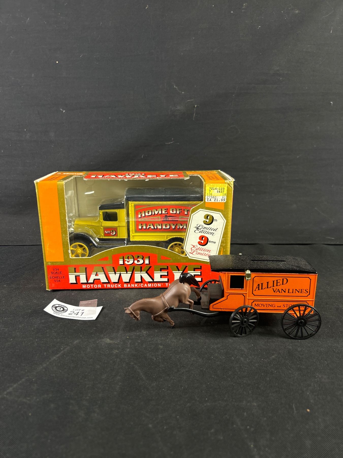 New In Box. 1931 Hawkeye Home Hardware 1:24 Scale Die Cast Collectible Piggy Bank Truck Plus Horse Pulled Allied Van Lines Wagon