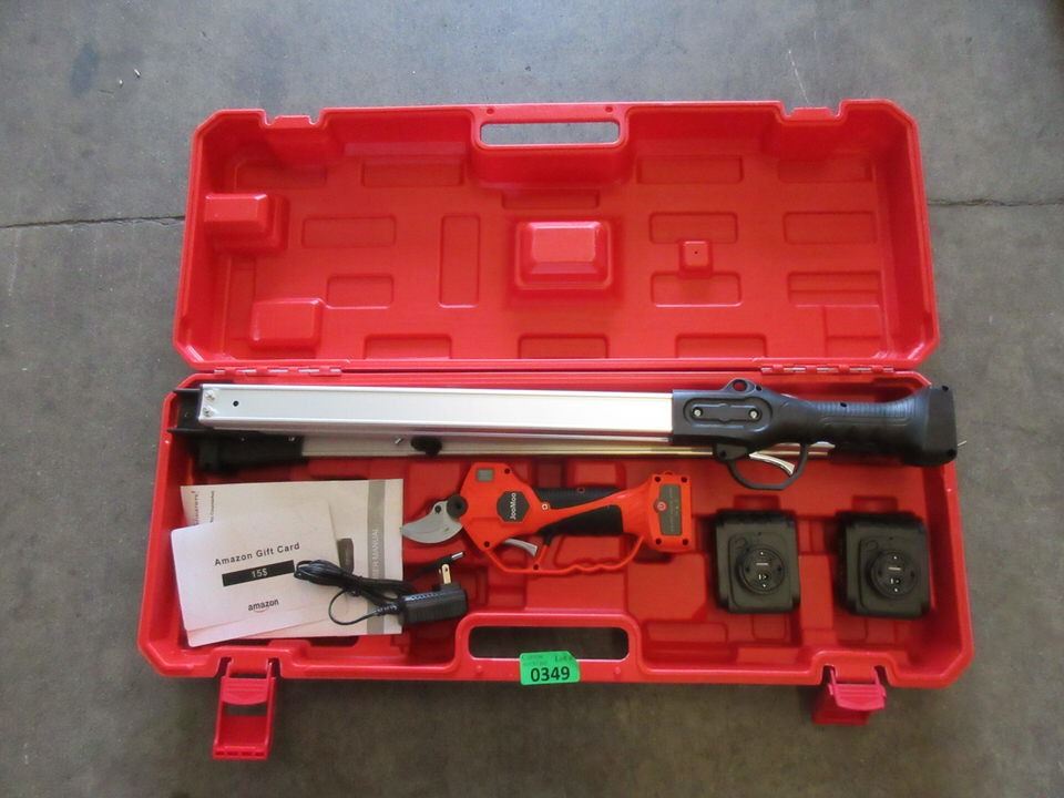 16.8V Professional Tree Branch Pruner with 7.5 Foot High Reach Extension Pole. 25-30 mm cutting diameter, LED Display Screen. Lithium Battery Powered.