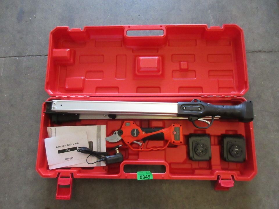 16.8V Professional Tree Branch Pruner with 7.5 Foot High Reach Extension Pole. 25-30 mm cutting diameter, LED Display Screen. Lithium Battery Powered.
