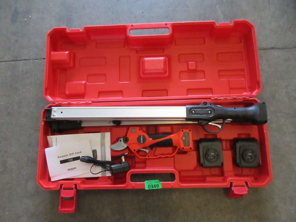 16.8V Professional Tree Branch Pruner with 7.5 Foot High Reach Extension Pole. 25-30 mm cutting diameter, LED Display Screen. Lithium Battery Powered.