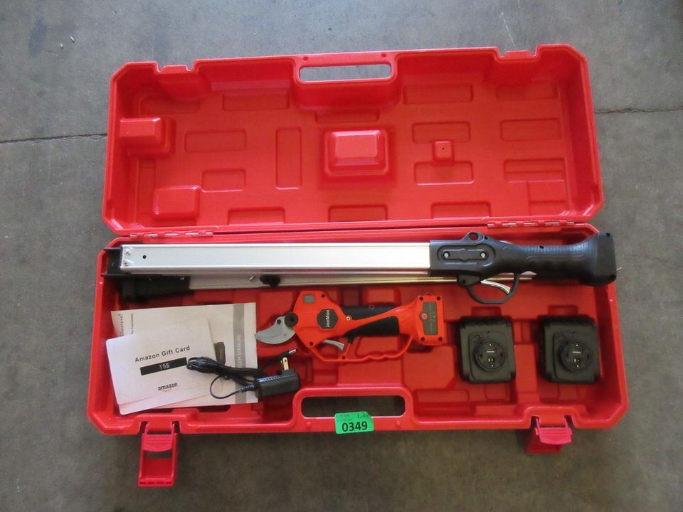 16.8V Professional Tree Branch Pruner with 7.5 Foot High Reach Extension Pole. 25-30 mm cutting diameter, LED Display Screen. Lithium Battery Powered.