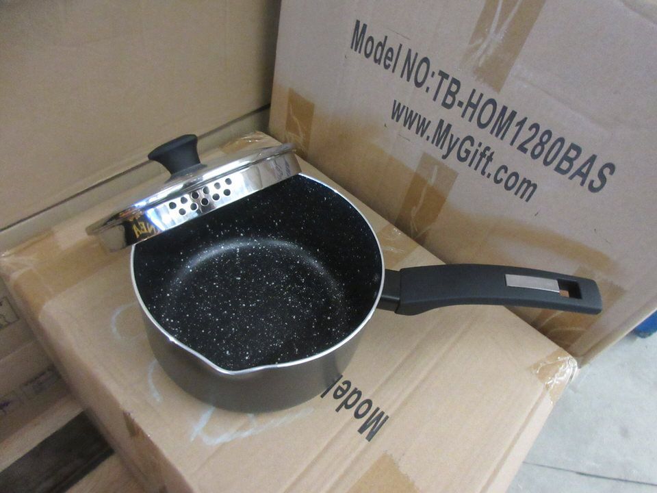 Lid has a perforated edge for straining and a spout on the pot for pouring.