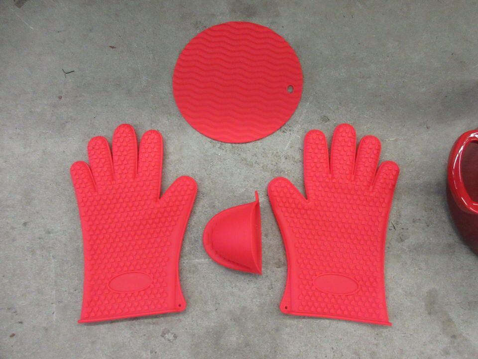 Red enamel coating. 9.45" x 12.5" x 4.4" deep. Includes silicone fingertip grip, trivet and pair of silicone gloves.
