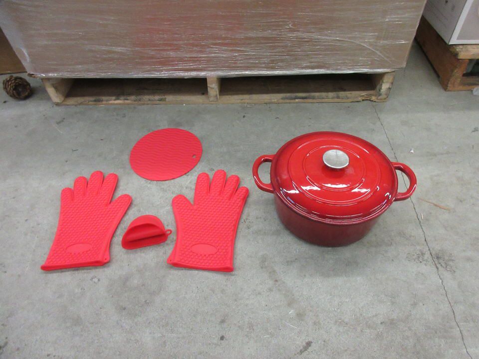 Red enamel coating. 9.45" x 12.5" x 4.4" deep. Includes silicone fingertip grip, trivet and pair of silicone gloves.