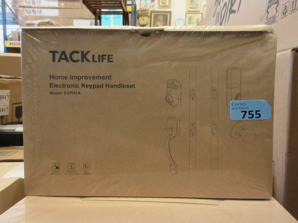 Door handle set with electronic keypad, single cylinder deadbolt, satin nickel finish. Tacklife Model: EKPH1A