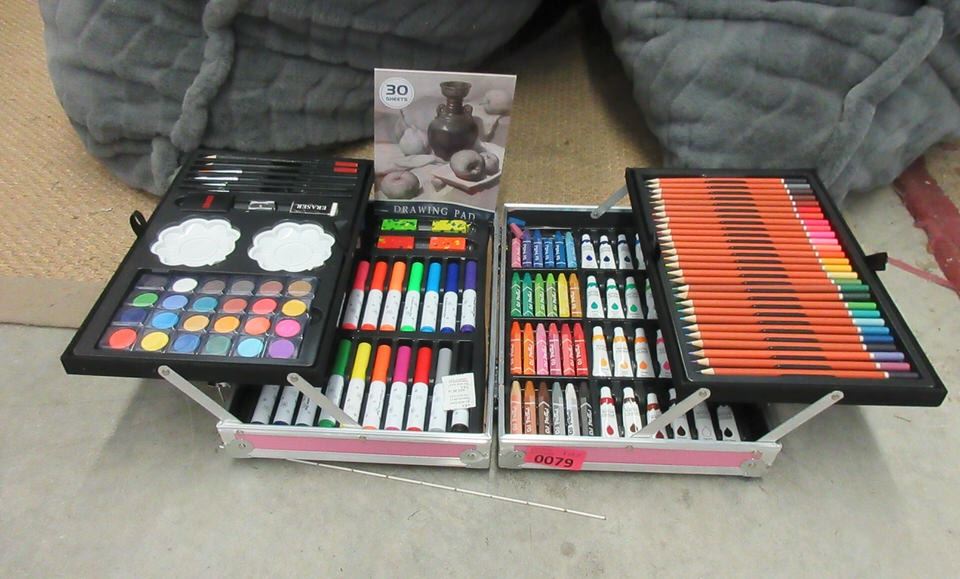 Dent in exterior case that doesn't affect the function. Oil pastels, colored pencils, markers, paints, camouflage crayons, palettes, brushes, and more.