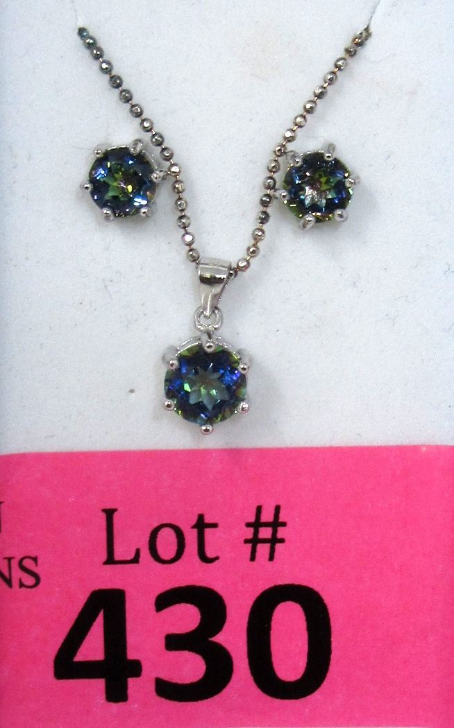 Sterling silver. Ocean blue topaz pendant & earrings. Round cut. 2.12 CT. Includes chain & $240 certificate.