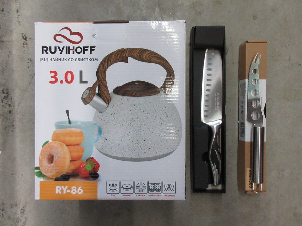 New 3 Litre Stove Top Kettle, New Stainless Steel Cheese Knife with 6" Blade, and New Becokay 7" Santoku Metal Handled Knife.
