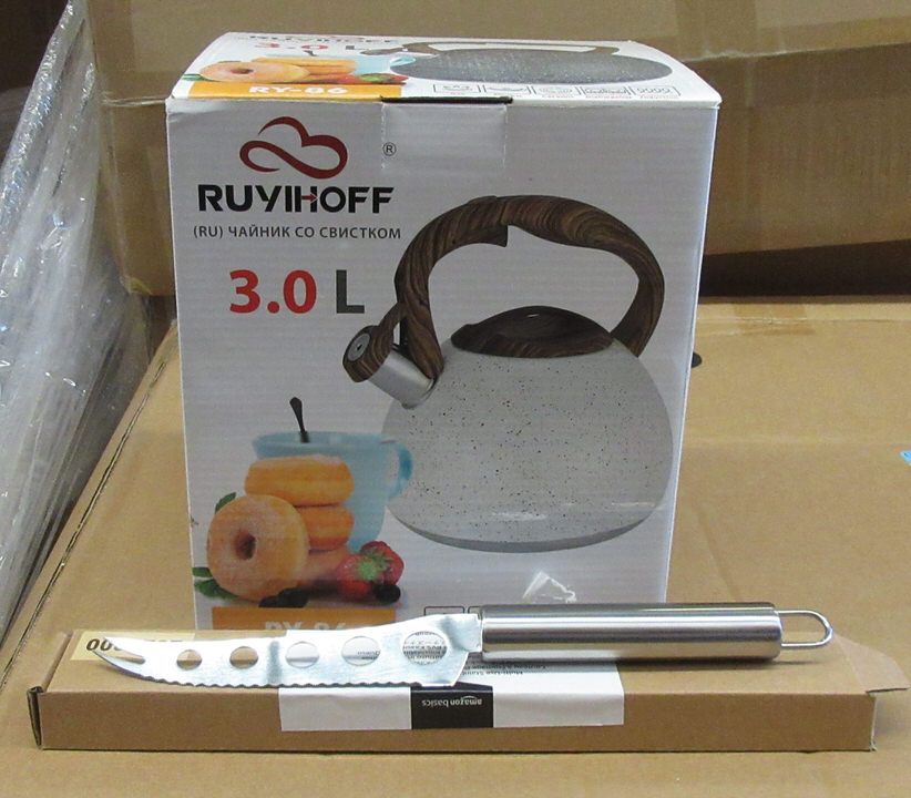 3 L whistling beige kettle with wood-look hard nylon handle. Cheese knife has an 8" blade.