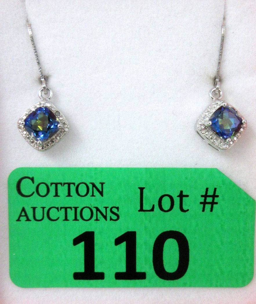 Princess cut, ocean blue mystic topaz set in sterling silver. Lever style backs. Includes $250 certificate.