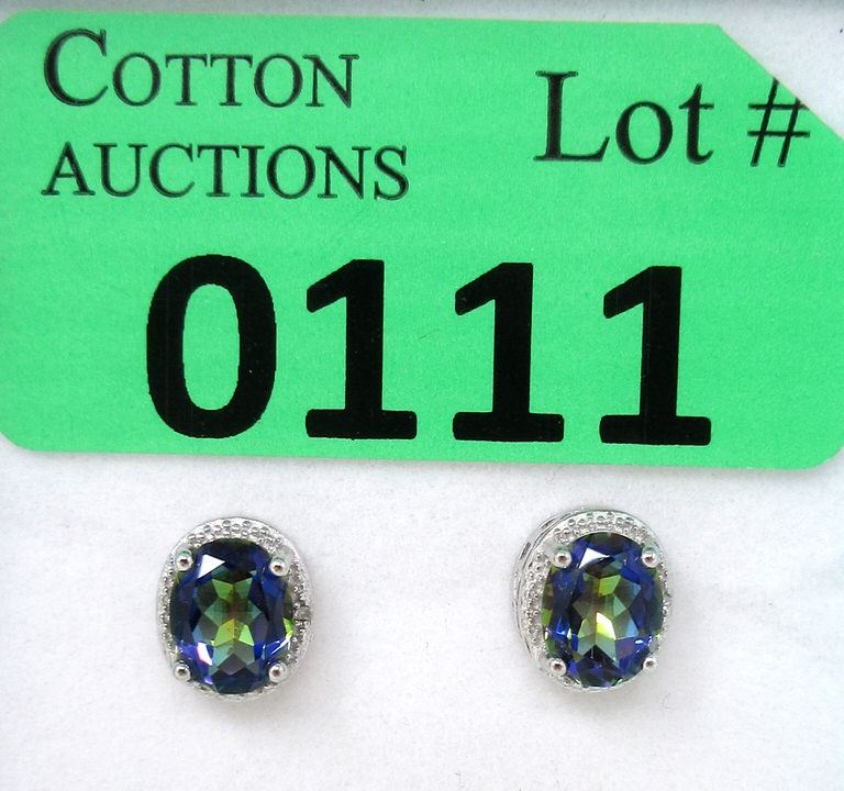 Oval cut, ocean blue mystic topaz set in sterling silver. Halo setting. Post & butterfly backs. Retail value $275.