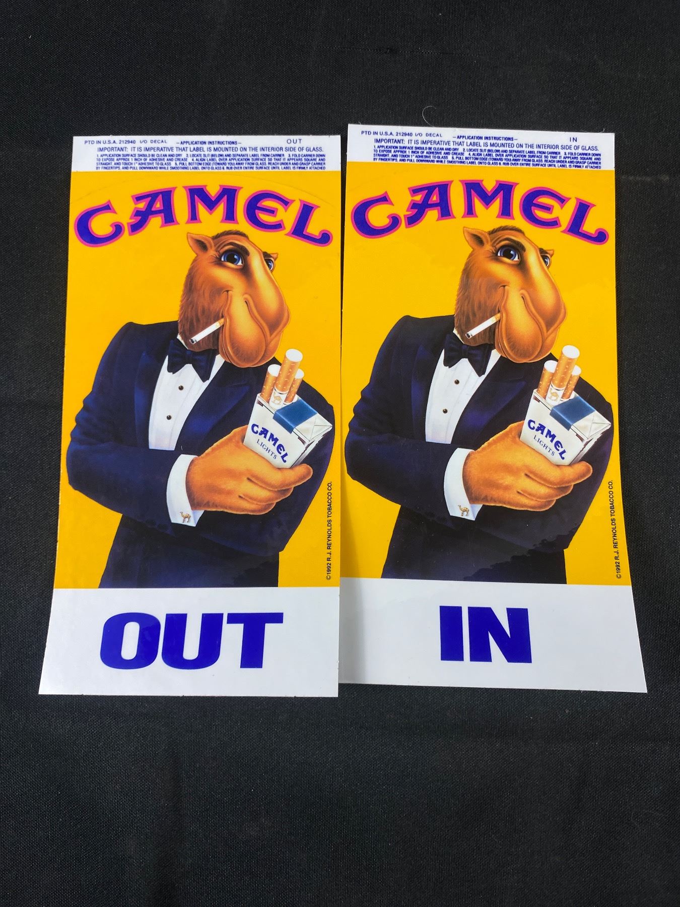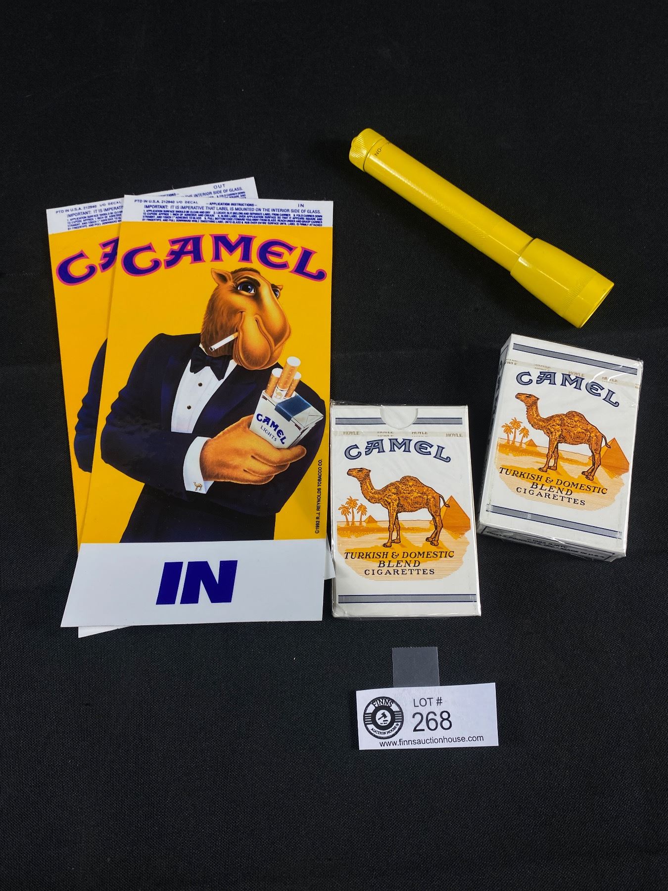 New Old Stock Vintage Camel Cigarettes Collectible Flashlight 2 Sealed Playing Cards.In/Out Store Decals All Good Condition