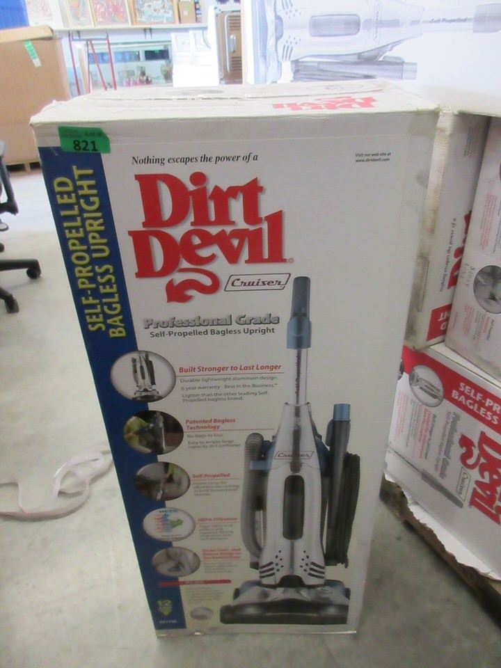 Dirt Devil. Self Propelled. Includes turbo tool. Dual headlights, 32" power cord, 15' cleaning path and stretch hose. Large dirt receptacle. Retails for $249.00.