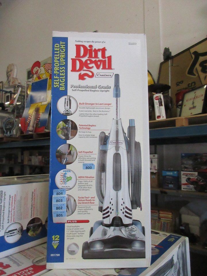Dirt Devil. Self Propelled. Includes turbo tool. Dual headlights, 32" power cord, 15' cleaning path and stretch hose. Large dirt receptacle. Retails for $249.00.