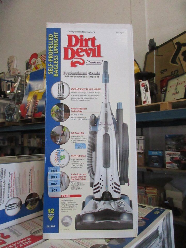 Dirt Devil. Self Propelled. Includes turbo tool. Dual headlights, 32" power cord, 15' cleaning path and stretch hose. Large dirt receptacle. Retails for $249.00.