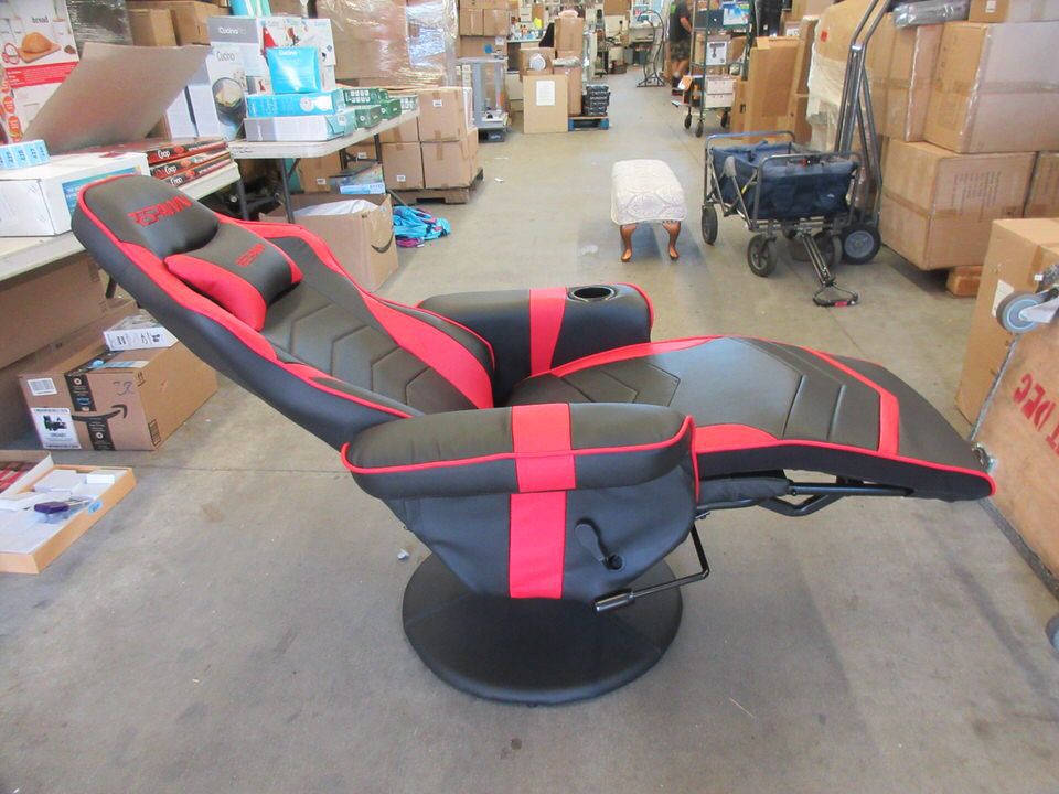 Black and red. The back reclines 135-degrees and moves independently of the extendable footrest. Cup holder in the left arm. Unassembled in box.