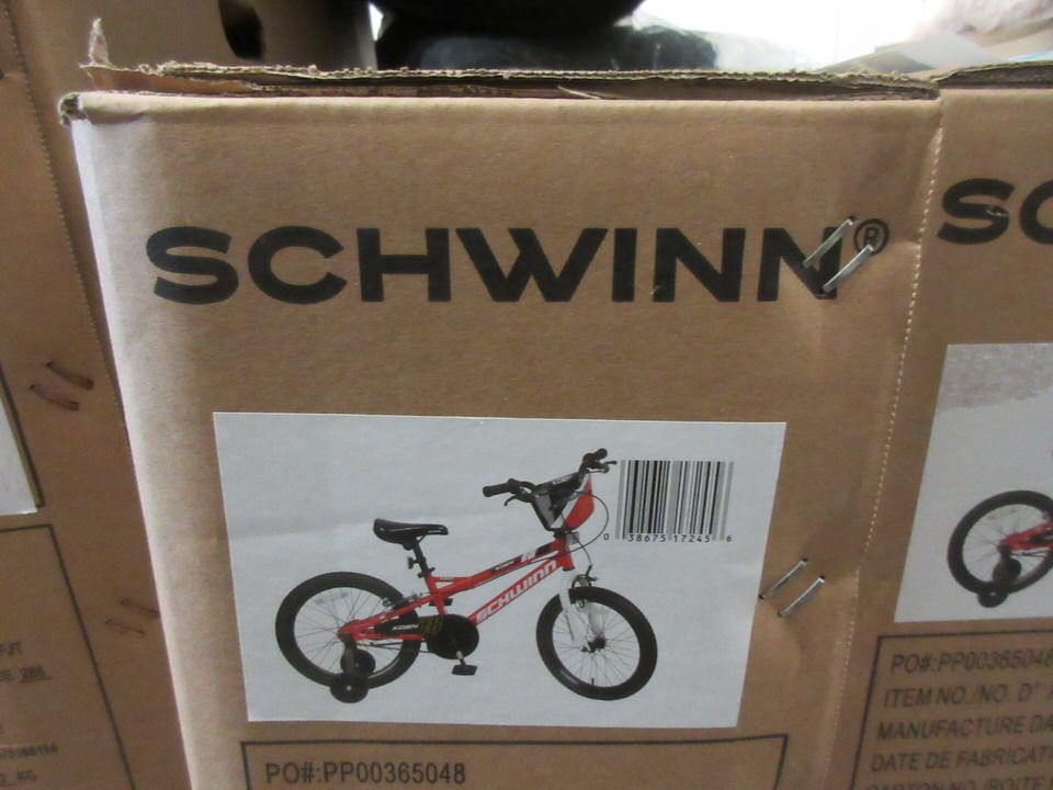 18" Wheels. Includes: training wheels, saddle handle, kickstand, chainguard, and number plate. UPC 038675172456.