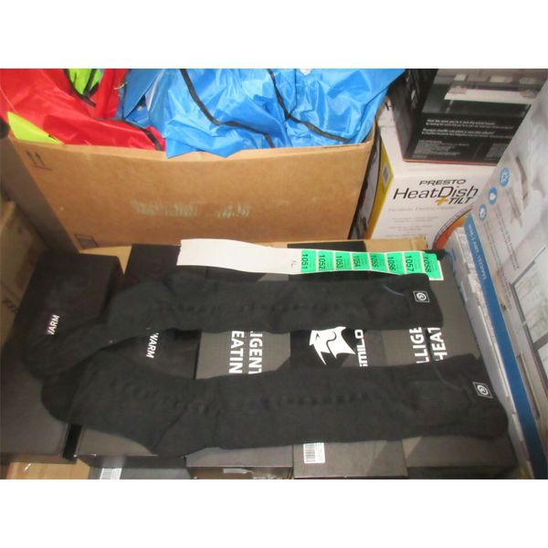 3 Temperature levels. Washable. Heat covers the entire toe area. Complete with batteries and charger.