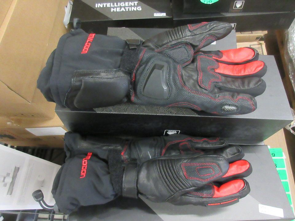 Thick water resistant shell with knuckle guards and leather palms . Complete with battery and charger.