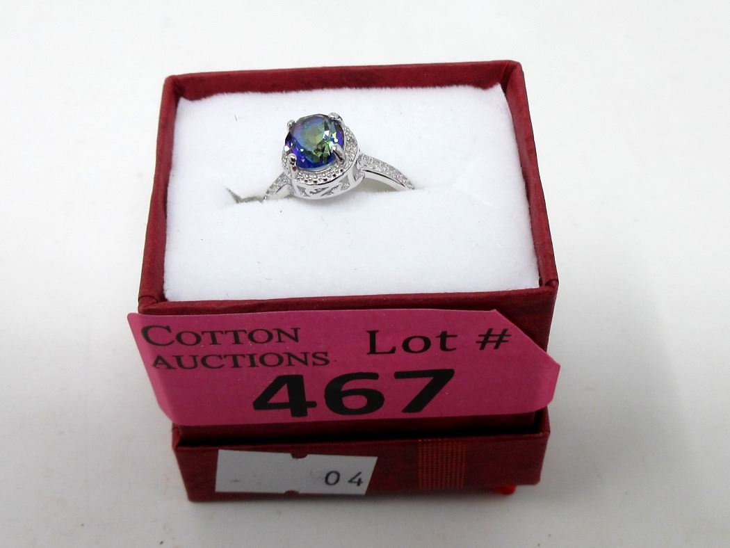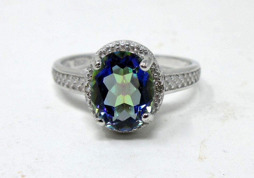 9mm x 7mm oval faceted topaz with accent diamond. Platinum overlay. Size 7. Includes $300 Certificate.