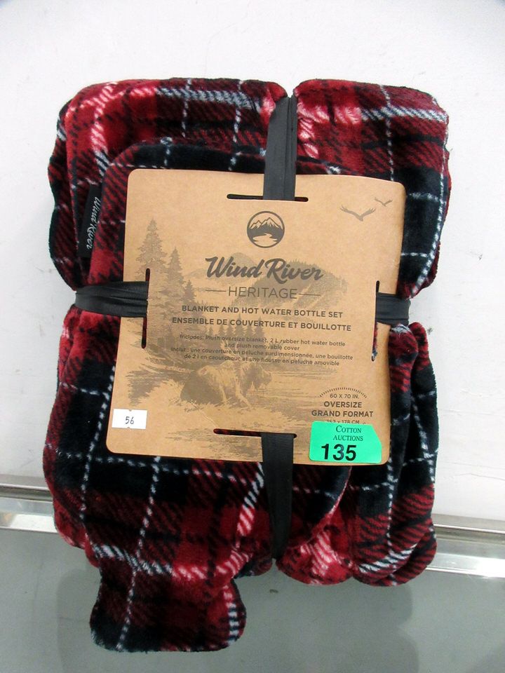 Red plaid. 60" x 70" blanket. 2 L Hot water bottle with cover.