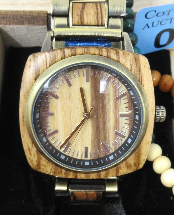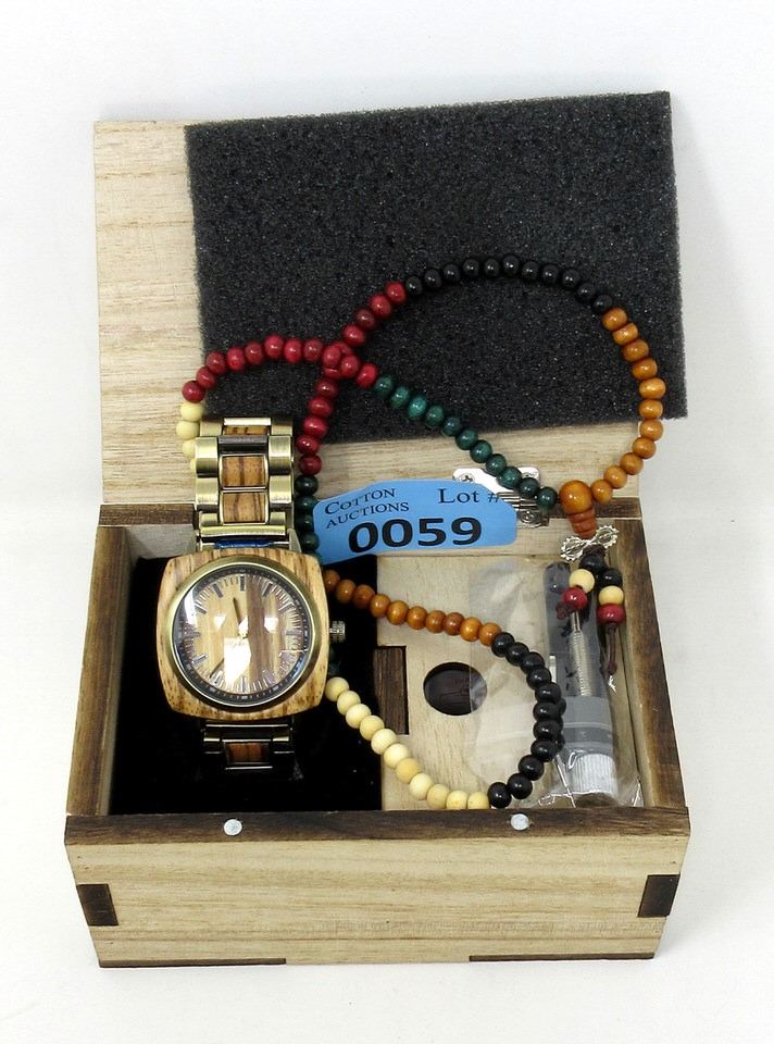 Complete with screwdriver to adjust watch strap and 20" wood necklace that can double as a wrap bracelet.