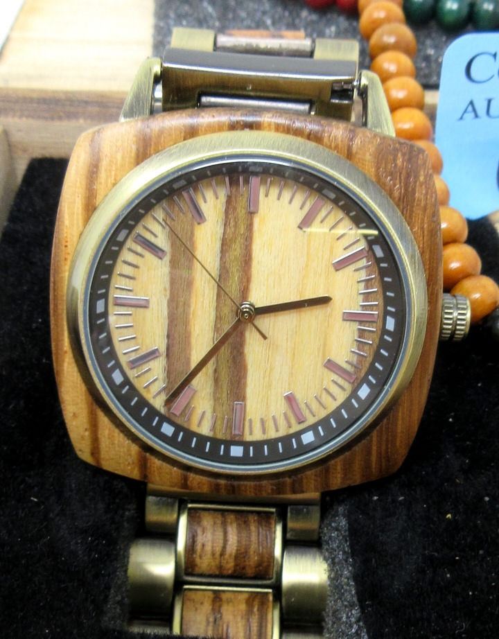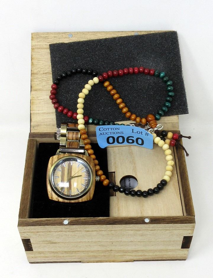 Complete with screwdriver to adjust watch strap and 20" wood necklace that can double as a wrap bracelet.